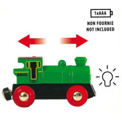 Diese klassische grüne Batterielok kann vorwärts und rückwärts fahren, und verfügt über einen Scheinwerfer, der den Weg leuchtet